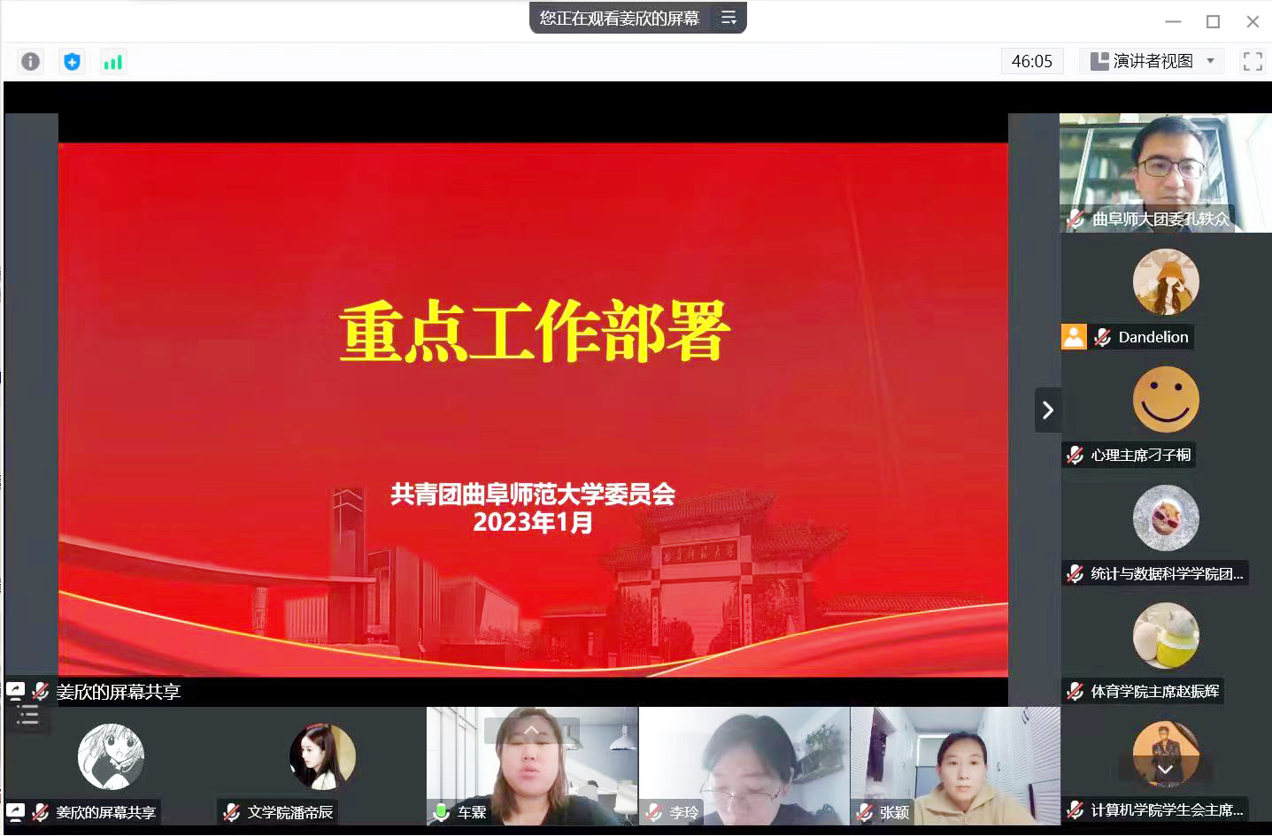 曲阜师大团委讯 1月8日,学校团委通过视频会议召开曲阜师大共青团九届三次全委(扩大)会议暨2023年共青团工作部署会,总结2022年共青团工作,对2023年共青团重点工作进行规划部署。校团委全体人员及各学院团委负责人、部分学生骨干参加会议。会议由校团委书记孔轶众主持。