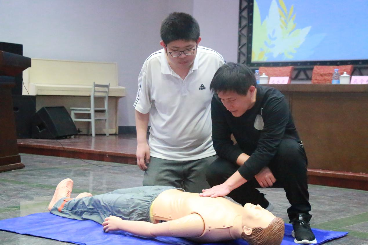 来自曲阜市人民医院胸痛中心行政总监及急诊医学科主任孔令东向同学们现场讲授心肺复苏、溺水急救、气管异物梗阻(海姆利克急救法)、烫伤急救等理论知识,进行专业的自救互救知识普及。在实操演练环节,他为同学们进行了心肺复苏的现场示范与海姆利克急救法模拟演练,并指导学生们进行实操演练。在一次次的反复练习后,同学们都能熟练地掌握急救的流程及操作要领。