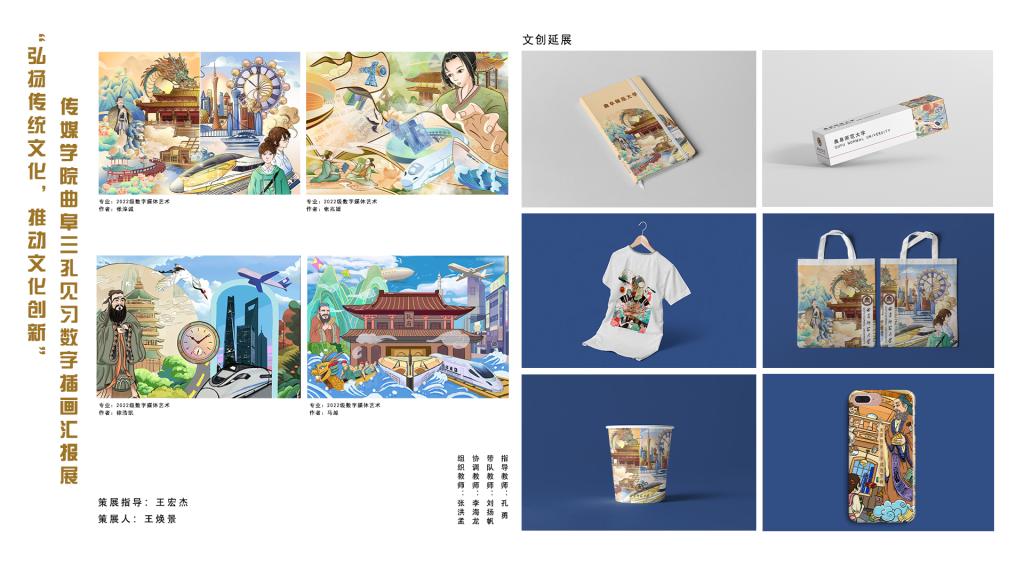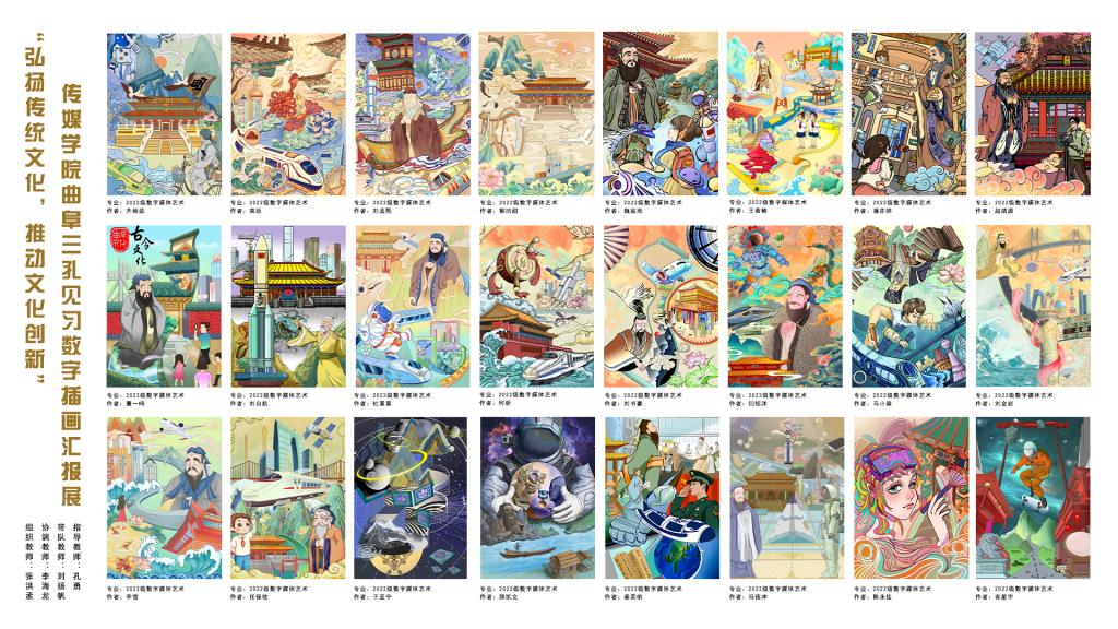 曲阜师大传媒学院讯  为进一步弘扬和传播传统文化,创作出富有孔子文化特色的系列创意作品,近期,传媒学院组织开展“弘扬传统文化,推动文化创新”——曲阜三孔见习数字插画汇报展。活动由传媒学院党委书记王宏杰担任策划指导、院长王焕景担任策展人、数字媒体系专业教师孔勇、李海龙指导。