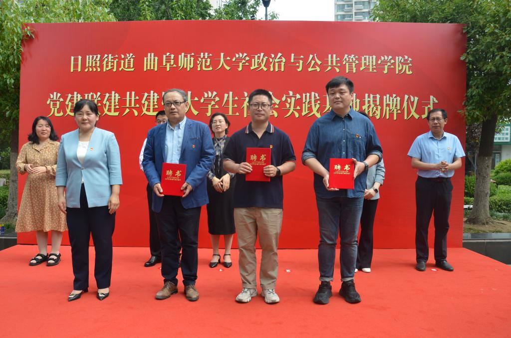 仪式上,王红、林士俊签订《大学生社会实践基地协议书》,日照街道凌云社区党总支书记田彦芳、政治与公共管理学院教工党支部书记林祥磊签订《党建联建共建协议书》。王红为林士俊、林祥磊、尹雷教授颁发特聘讲师聘书。