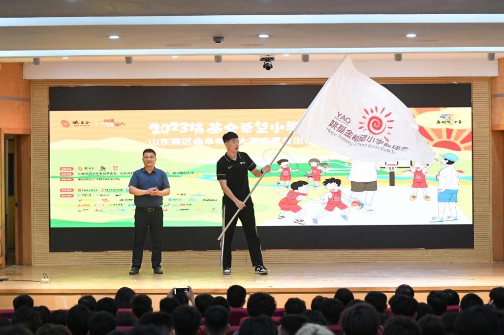 山东省青少年发展基金会资助部部长董晓峰为志愿者代表李柯阳授姚基金希望小学篮球季旗,米兰网团委书记孔轶众为志愿者代表马蔓妮授姚基金希望小学篮球季支教志愿者旗。