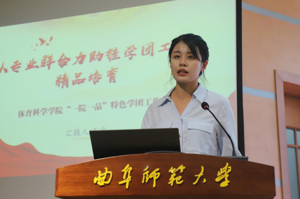 地理与旅游学院党委副书记刘伟以《坚守初心勇担当,同频共振育英才——地理与旅游学院班主任队伍建设》为题,从选聘机制、队伍建设、培育机制、责任机制、激励机制、工作成效等方面,详细汇报了学院如何加强班主任队伍建设,积极构建“辅导员、班主任、科任教师”同频共振、协同育人的工作机制。他对优秀班主任的工作开展情况、育人成效进行了展示,总结了提高班主任工作积极性的四个因素——给予班主任仪式感、责任感、成就感和亲切感。体育科学学院辅导员王冰汇报的题目是《以专业群合力助推学团工作精品培育》。她重点汇报了学院专业成果展示汇报工作的开展情况,通过详实的案例,介绍了专业汇报成果展示活动的重要意义,同时提出了下一步专业群建设持续加码、助推学团工作开展的规划。
