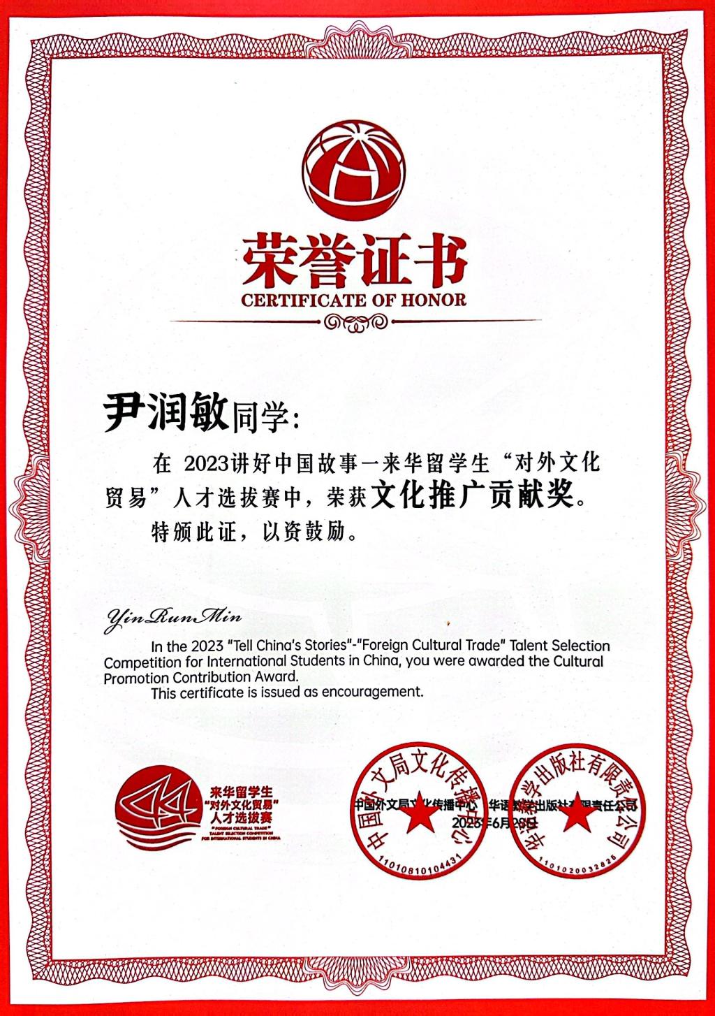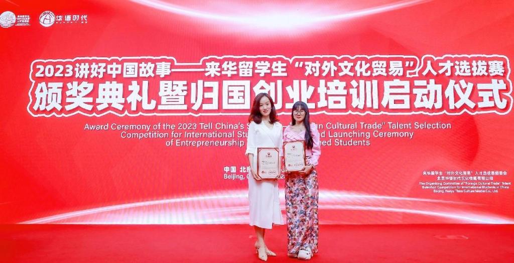 国际教育学院讯   6月28日,由中国外文局文化传播中心、华语教学出版社主办的“2023讲好中国故事——来华留学生‘对外文化贸易’人才选拔赛”颁奖典礼暨归国创业培训启动仪式在中国外文局隆重举行。经网络投票与专业评审,曲阜师大缅甸籍留学生尹润敏(AYE NWE NWE)从8000余名参赛学生中脱颖而出,获得“文化推广贡献奖”,曲阜师大荣获“优秀院校组织奖”,国际教育学院晁亚若、司甫老师获得“优秀指导教师奖”。