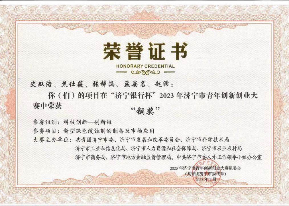 本届大赛聚焦济宁市高质量发展,设置科技创新、乡村振兴等领域,自今年4月份启动以来,吸引了310余个项目参赛,经过激烈角逐,共评选出金奖5个、银奖10个、铜奖15个、优秀奖6个。曲阜师大化学与化工学院史双浩同学的项目《新型绿色缓蚀剂的制备及市场应用》荣获大赛铜奖并获得三万元的创业助推金。