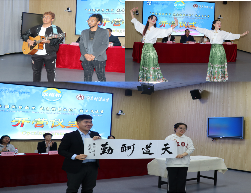 随后马达加斯加籍国际学生文彬和李希杰演唱了中文歌曲《情歌》,越南籍国际学生杜氏水和吴氏秋芳带来了中国风舞蹈表演《借月》,学校书法学院的潘禹彤同学现场展示了书法作品,一个个精彩的节目,将开营仪式的气氛推向了高潮,线上学员纷纷留言评论。