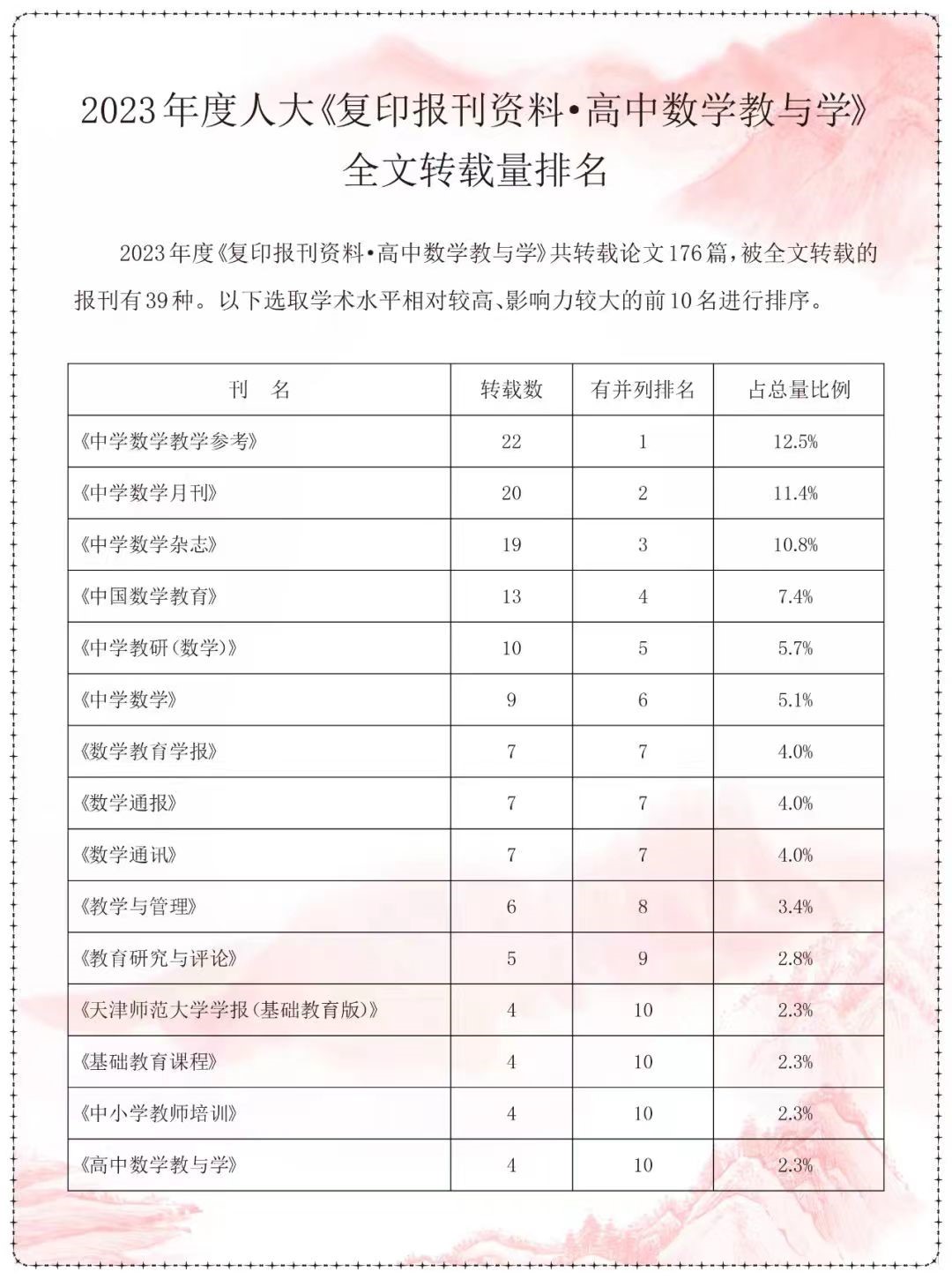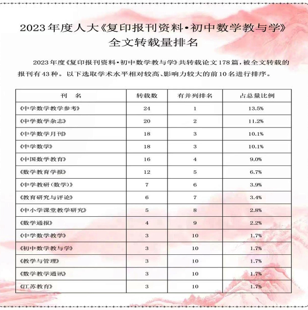 曲阜师大《中学数学杂志》讯 近日,根据中国人民大学书报资料中心全文数据库检索情况,米兰网《中学数学杂志》被《复印报刊资料》系列刊(2023年度)全文转载的文章39篇。《复印报刊资料·初中数学教与学》共转载论文178篇,被全文转载的报刊有43种,《中学数学杂志》(初中版)被转载20篇,占总量的11.2%,第2名;《复印报刊资料·高中数学教与学》共转载论文176篇,被全文转载的报刊有39种,《中学数学杂志》(高中版)被转载19篇,占总量的10.8%,排名第3;全年总转载数39篇,第2名;杂志全年总发文数184篇,被转载比全国同类期刊第1。
