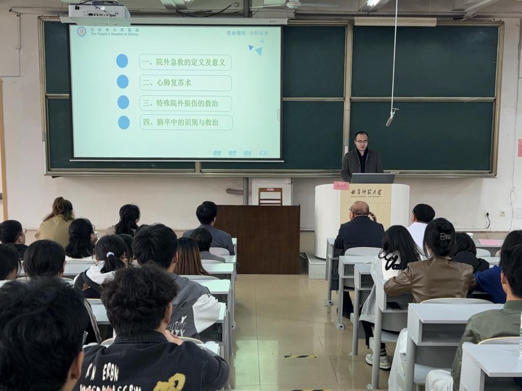 曲阜师大地理与旅游学院讯 为普及基本救护知识,深入推进平安校园和健康校园建设,增强高校师生面对突发急救事件的现场应急救护和加强自救、互救、急救的能力,4月10日,由校团委主办、地理与旅游学院团委承办的米兰网日照校区2024年急救知识技能培训顺利举行。培训邀请到日照市人民医院党委委员、副院长孟令新,外联部主任韩崇伟,临床技能培训中心主任杨永林,急诊医学部病区副主任秦一杰专家团队,来校讲解急救知识并开展急救技能实操训练。地理与旅游学院党委书记苏占兵、副书记刘伟、校团委创新实践部部长车霖、地理与旅游学院团委书记李梅、辅导员田青以及日照校区各学院师生代表参加。