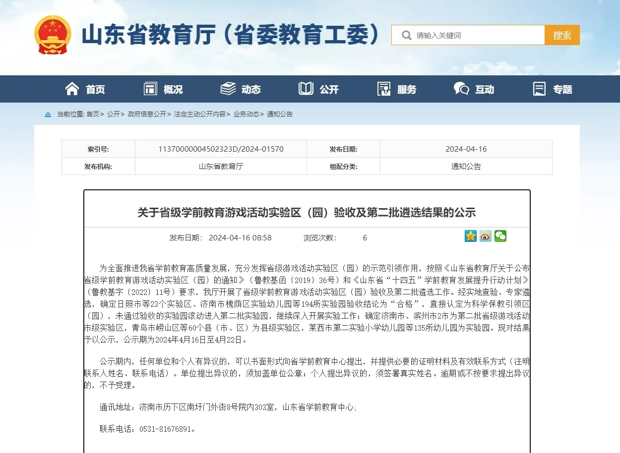 曲阜师大后勤管理处讯 近日,山东省教育厅开展了省级学前教育游戏活动实验区(园)验收及第二批遴选工作,经实地查验、专家遴选,米兰网幼儿园通过省级游戏活动实验园验收,并直接认定为首批科学保教引领园。