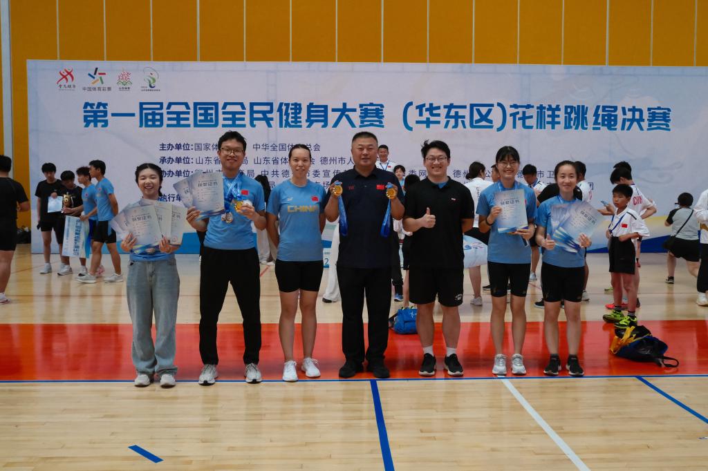 曲阜师大体育教学部讯 7月10至14日,由国家体育总局、中华全国体育总会主办,山东省体育局承办的第一届全国全民健身大赛(华东区)花样跳绳比赛在德州体育中心举办。曲阜师大六名运动员被选拔且代表山东队(青年组)参加了比赛,比赛中不畏强手,顽强拼搏,为山东队取得了四金、三银、一铜的好成绩。