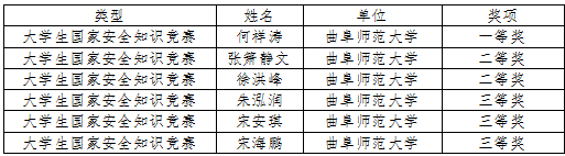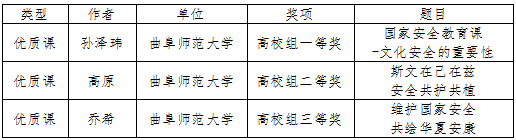 学生工作处讯 近日,山东省教育厅公布了2024 年国家安全宣传教育系列活动评选结果,曲阜师大获国家安全宣教优质课高校组一等奖1项、二等奖1项、三等奖1项,获大学生国家安全知识竞赛一等奖1项、二等奖2项、三等奖3项。