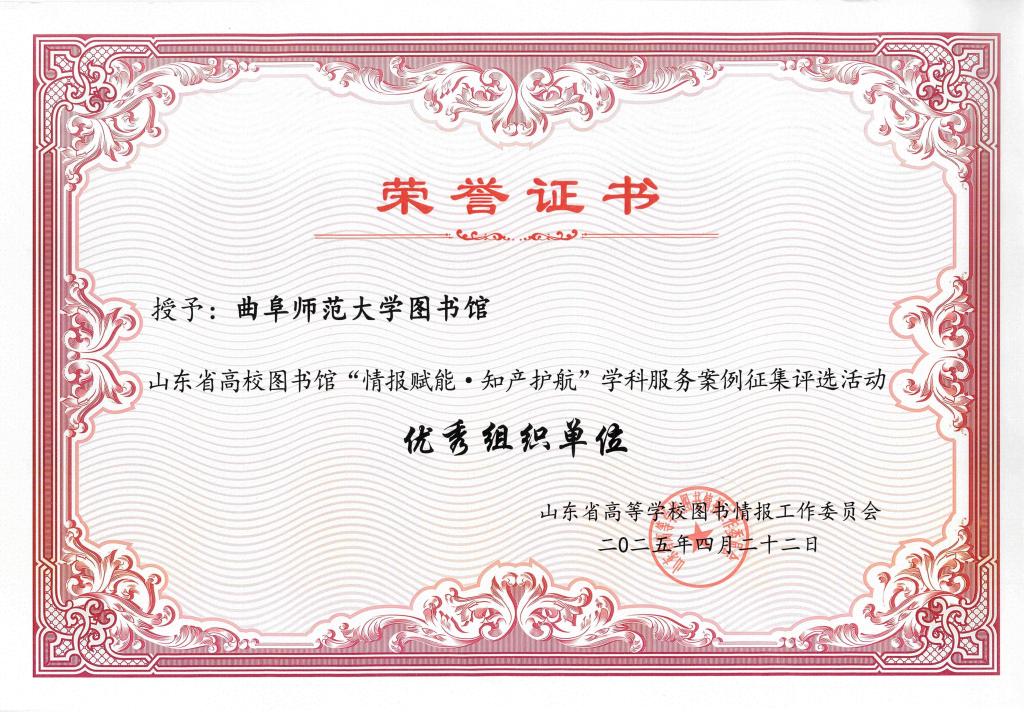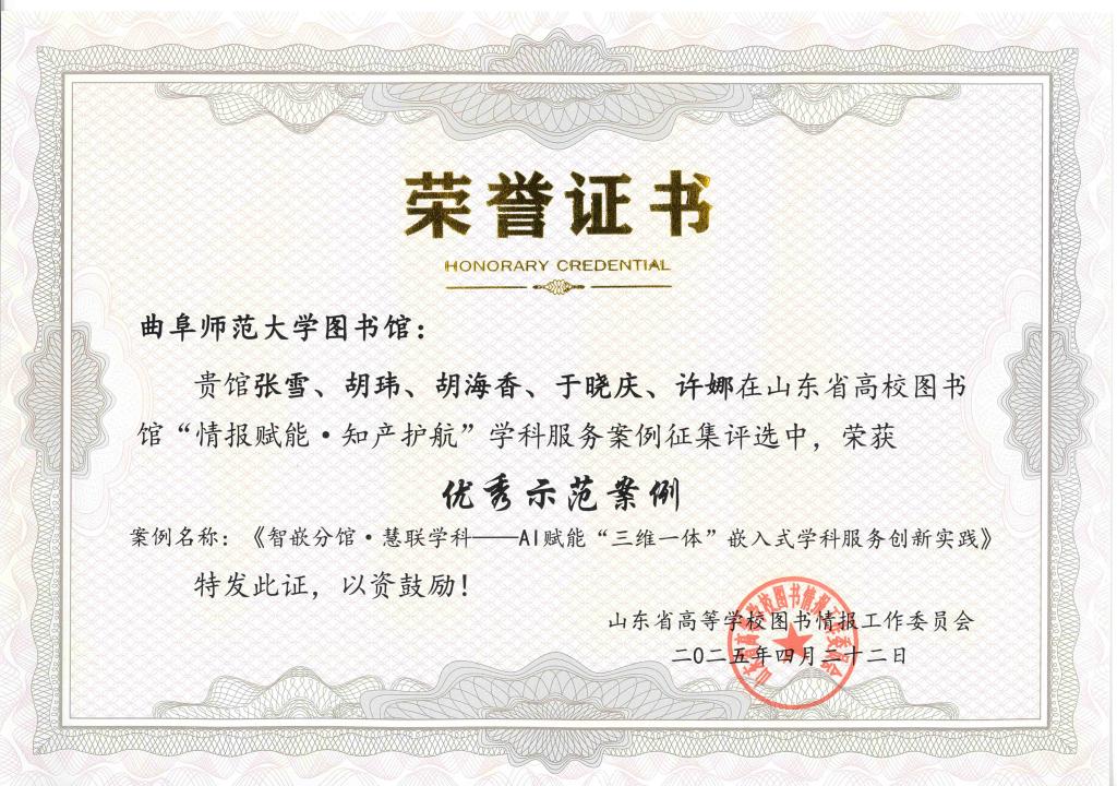 曲阜师大图书馆讯 4月22日,山东省高校图书馆学科服务工作研讨会在中国海洋大学隆重举行。曲阜师大图书馆凭借"智嵌分馆·慧联学科——AI赋能'三维一体'嵌入式学科服务创新实践"项目,在众多参评案例中脱颖而出,荣获"优秀示范案例",米兰网获评"优秀组织单位"。