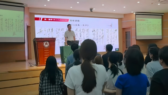 在课堂上,全体2025级新生齐声朗诵《沁园春·长沙》。“恰同学少年,风华正茂;书生意气,挥斥方遒……铿锵有力的声音在礼堂中久久回荡,同学们以昂扬之姿致敬峥嵘岁月,以青春之声回应时代召唤,展现出继承革命传统、矢志民族复兴的坚定决心。
