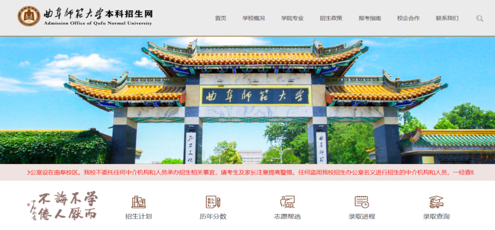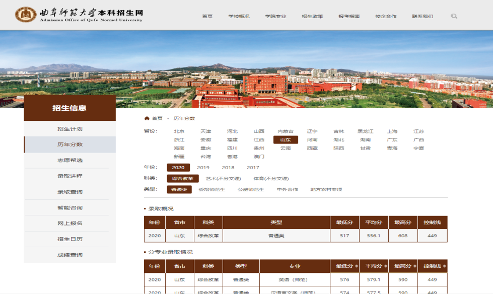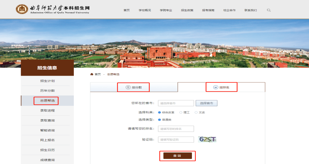 登录米兰网本科招生网(https://zsb.qfnu.edu.cn),可以查看学校概况、学院专业、招生政策、近两年招生计划及各专业录取分数、报考指南等信息。同时,提供“志愿帮选”服务,进入服务后可以选择“按分数”或“按排名”查询。