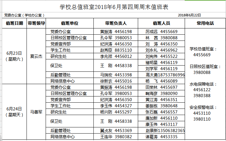 学校总值班室2018年6月第四周周末值班表