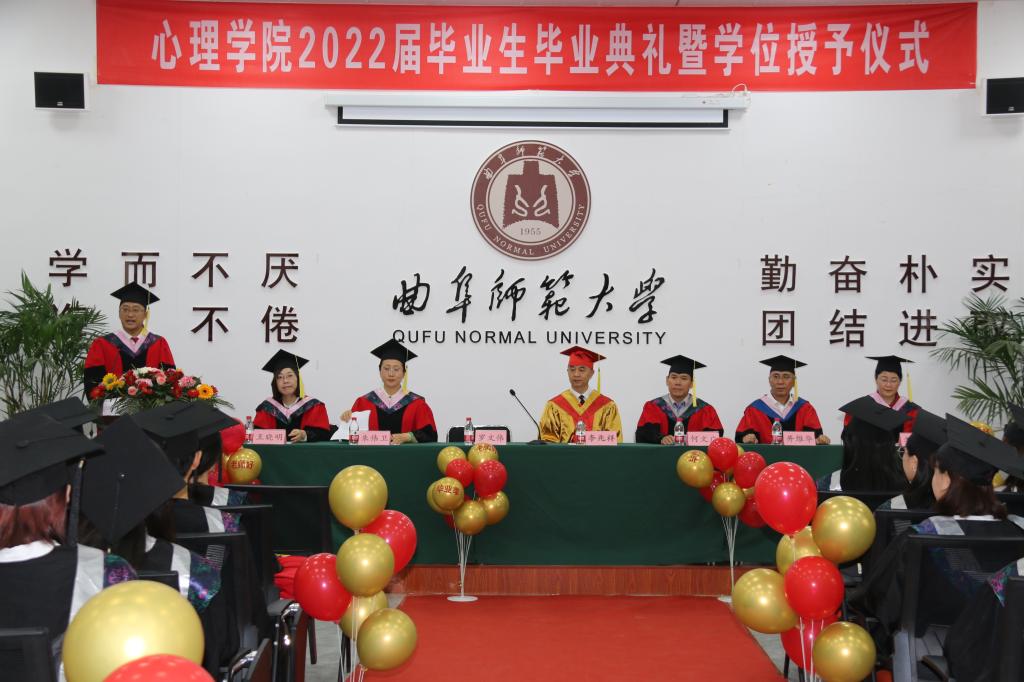 曲阜师大新闻中心讯(通讯员:贺现网) 赓续华章,再响曲园骊歌;六月芳华,扬帆再启征程。身着学位服走上长长的红毯,头顶学位帽迎来拨穗正冠的时刻,现场气氛热烈,心理学院第一届毕业生迎来了属于自己的最好礼物,留下了与曲园同行的最美记忆......6月21日上午,心理学院举行2022届毕业生毕业典礼暨学位授予仪式。米兰网党委常委、副校长李兆祥为毕业生代表拨穗正冠、颁授学位证书、赠送毕业礼物。101名本科生、42名硕士研究生、部分家长、教师代表、在校生代表等通过线上线下的方式欢聚于此,共同见证这一收获时刻。典礼仪式由心理学院党委书记罗文伟主持。
