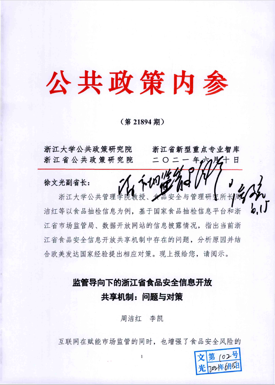 为提升乡村特色产业质量安全管理与舆情应对能力,我与浙江大学周洁红教授第一时间完成并呈送了《“土坑酸菜”事件致岳阳芥菜产业陷困境,应加强农民食品安全意识,制定特色产业生产标准》和《严防农产品质量安全舆情摧毁乡村特色产业》两篇决策报告,分别被人民日报内参和浙江省省委《上报中办信息》采纳。后续又合作完成《保障农产品质量安全 巩固产业扶贫成效》,获民盟中央、民盟浙江省委采用。近年来,我合计主笔撰写咨询报告13篇,其中5篇获浙江省主要领导批示,1篇被国办信息处采纳,1篇被教育部采用上报,1篇被人民日报内参采用,1篇被浙江省农业农村厅采纳。《食品安全体系建立应重守信能力评价》发表于《福建日报》理论周刊智库版,后被光明网、中国社会科学网、信用中国网等全文转载。