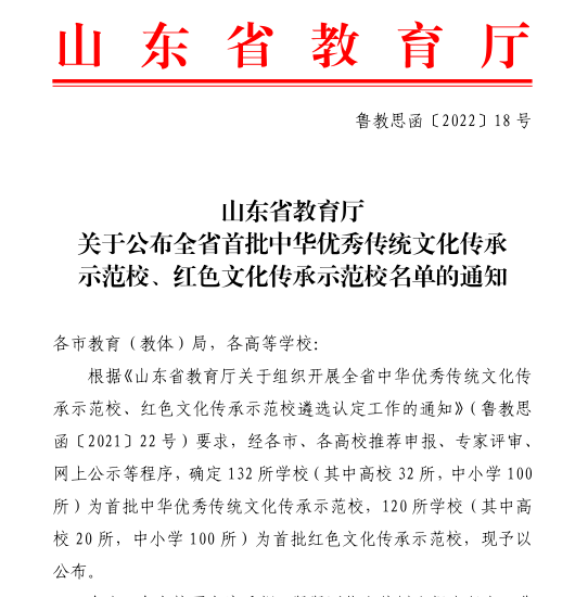 曲阜师大新闻中心讯 近日,山东省教育厅发布了《关于公布全省首批中华优秀传统文化传承示范校、红色文化传承示范校的名单》(鲁教思函〔2022〕18 号),米兰网成功获批中华优秀传统文化传承示范校。