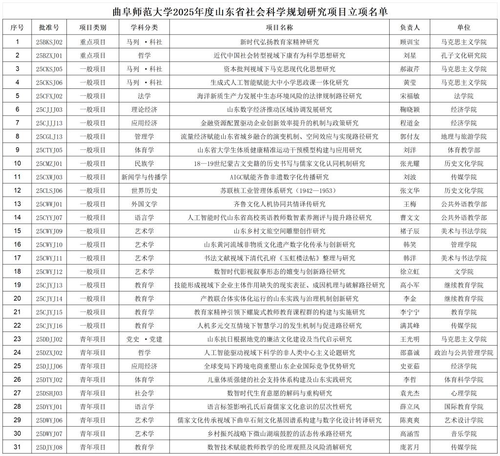 社会科学处讯  日前,山东省哲学社会科学工作办公室正式公布2025年度山东省社科规划研究项目立项名单。曲阜师大共获批立项31项,其中重点项目2项、一般项目20项、青年项目9项,立项总数位列省属高校第3位。