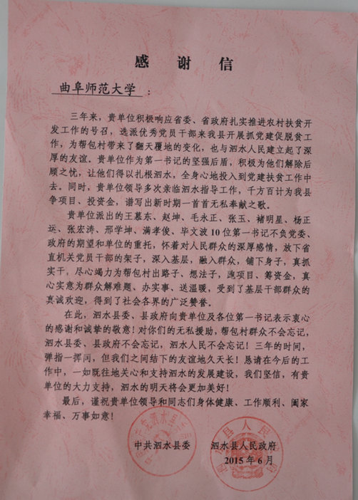 泗水县委县政府致信感谢我校“第一书记”帮扶工作