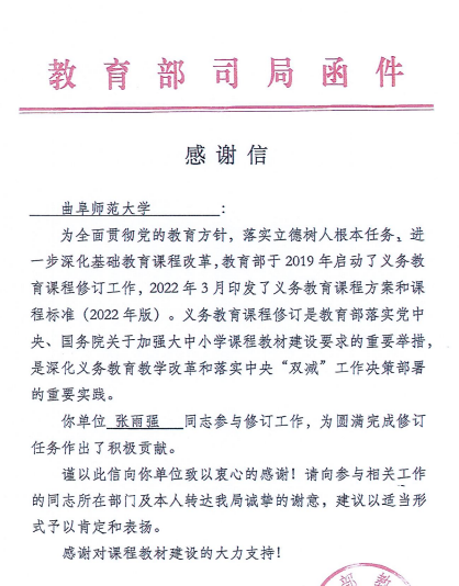 教育部教材局致信感谢曲阜师大助力全国义务教育课程方案与课程标准修订工作